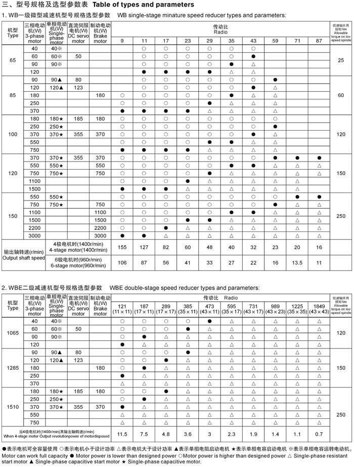 淡季减速比机型有WB65 WB85 WB100 WB120 WB150 . 其减速比分别有 9 11 17,23,29,35,43,59,71